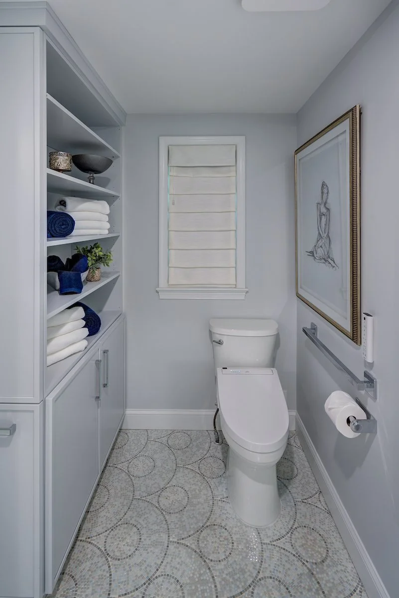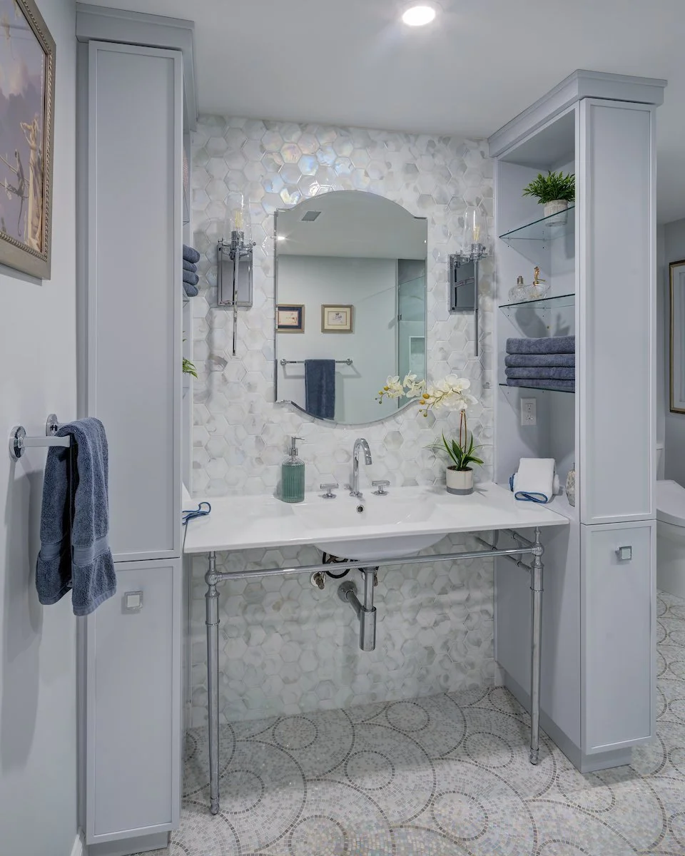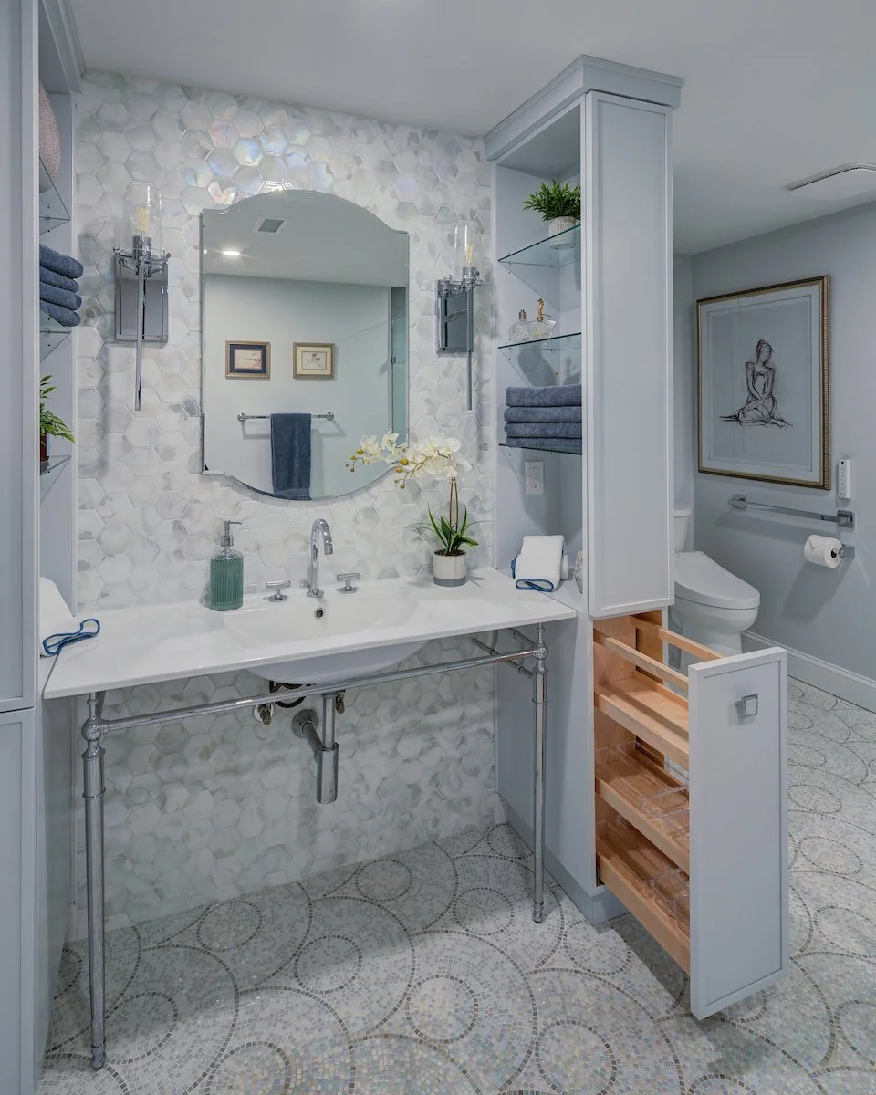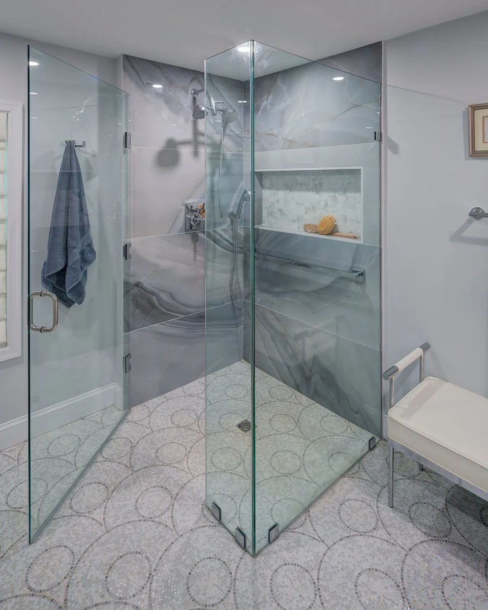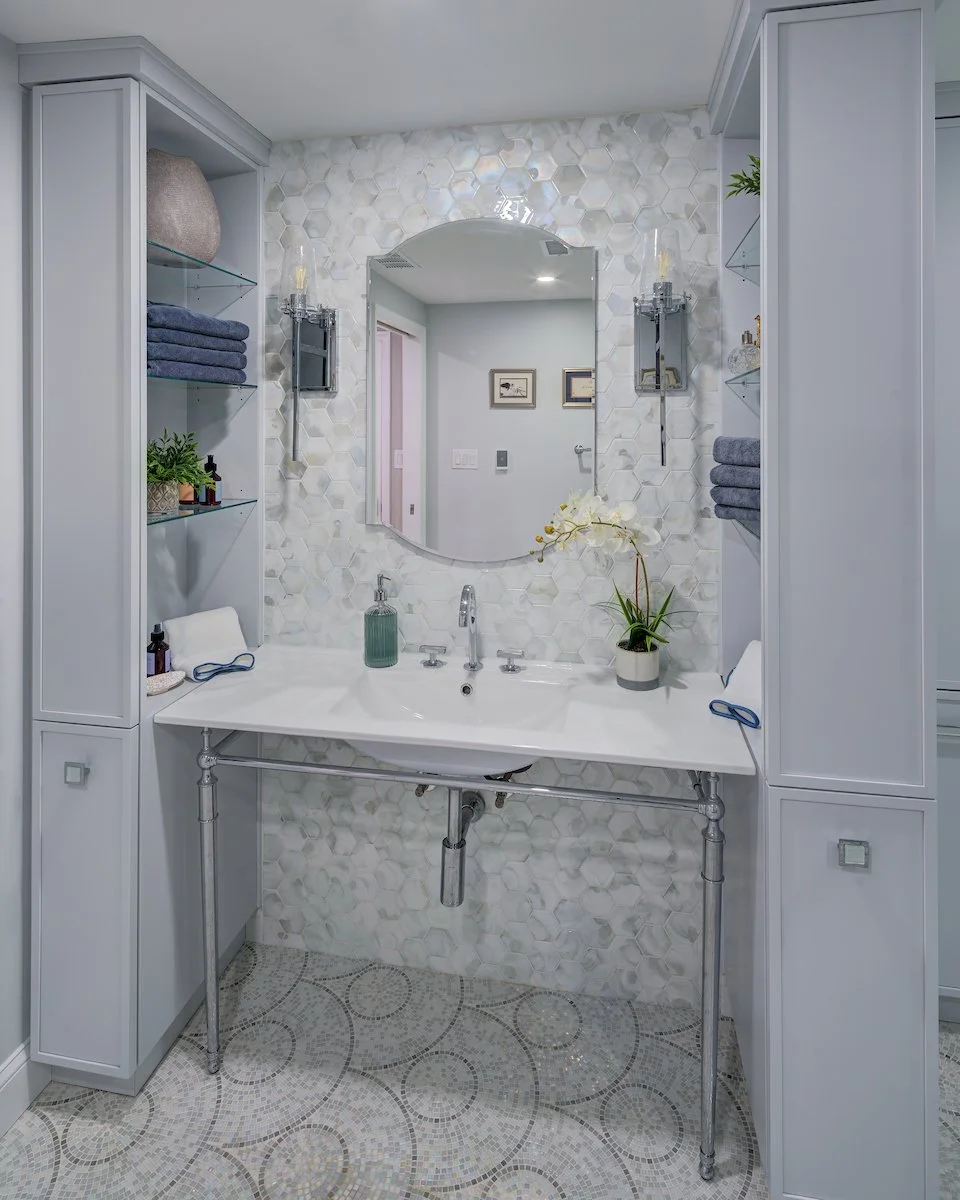Designed with elegance and accessibility in mind, this serene primary bathroom exemplifies thoughtful aging-in-place principles without compromising on style. A curated mosaic floor adds visual rhythm and tactile interest, while iridescent floor-to-ceiling tile behind the vanity brings depth and luminosity to the space.