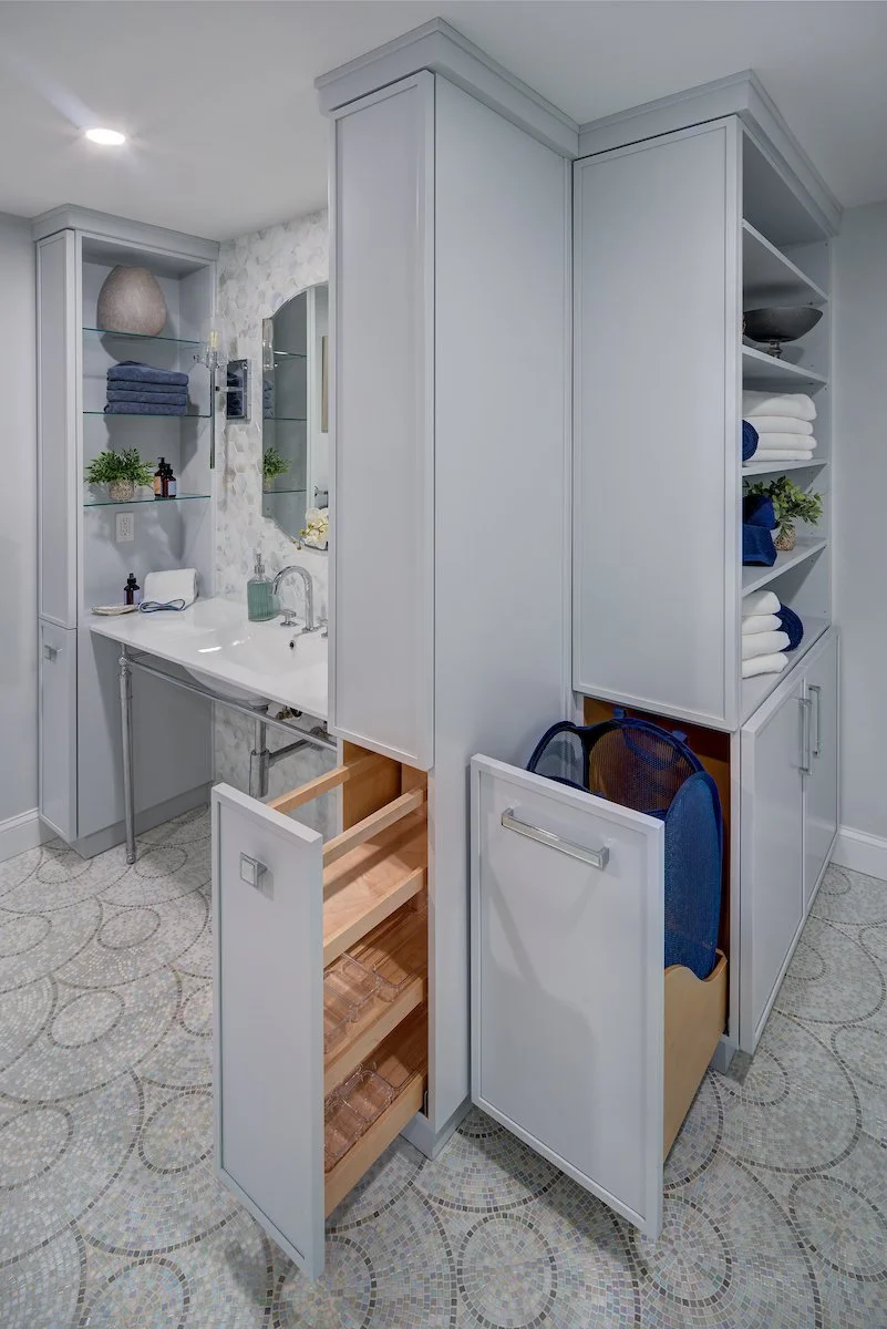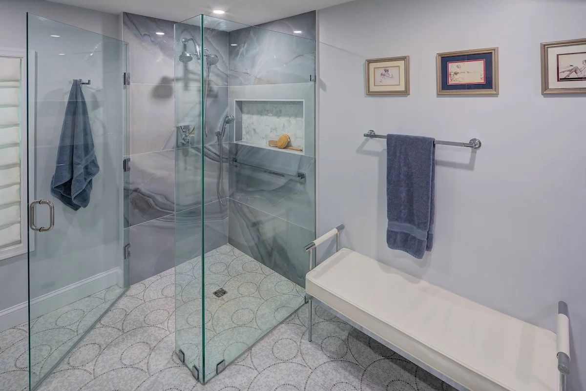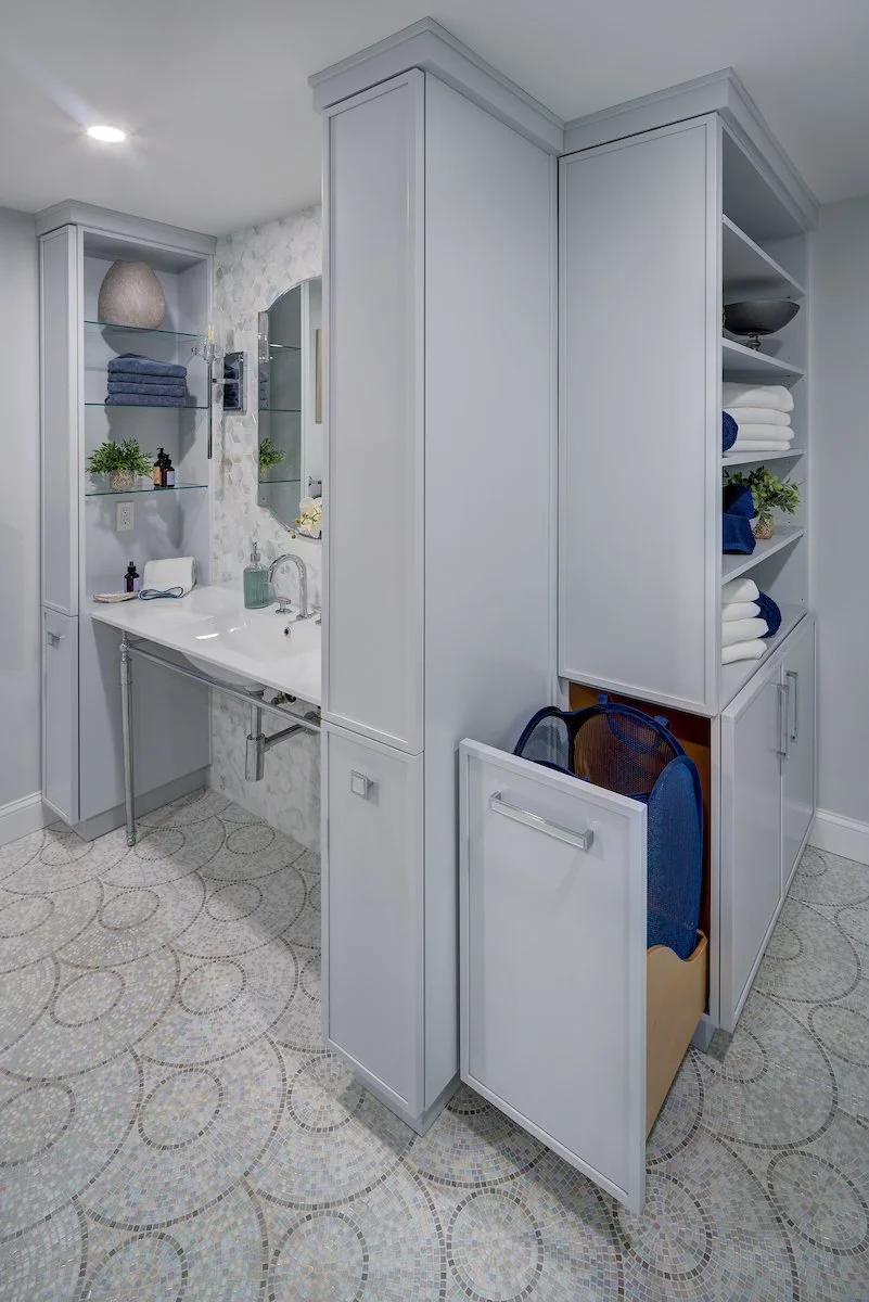 The sleek porcelain tile in the curbless shower enhances high-end aesthetic while the grab bars ensure safety. Ambient lighting, layered textures, and refined materials come together to create a tranquil retreat — functional, sophisticated, and responsive to long-term living needs.
